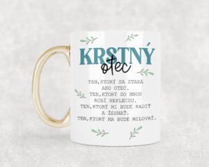 Tento elegantný hrnček s jemným kvetinovým motívom a zlatým uchom je krásnym spôsobom, ako poďakovať a vyjadriť vďaku krstnému otcovi, ktorý má v živote dieťaťa výnimočné miesto. Nápis na hrnčeku vystihuje jeho dôležitú úlohu,byť oporou, radcom, ochrancom a sprievodcom na životnej ceste.