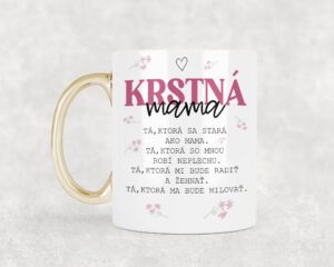 Tento elegantný hrnček s jemným kvetinovým motívom a zlatým uchom je krásnym spôsobom, ako poďakovať a vyjadriť lásku krstnej mame, ktorá má v živote dieťaťa výnimočné miesto. Nežný nápis vystihuje presne to, čo krstná mama znamená starostlivosť, láskavosť, radu aj požehnanie.