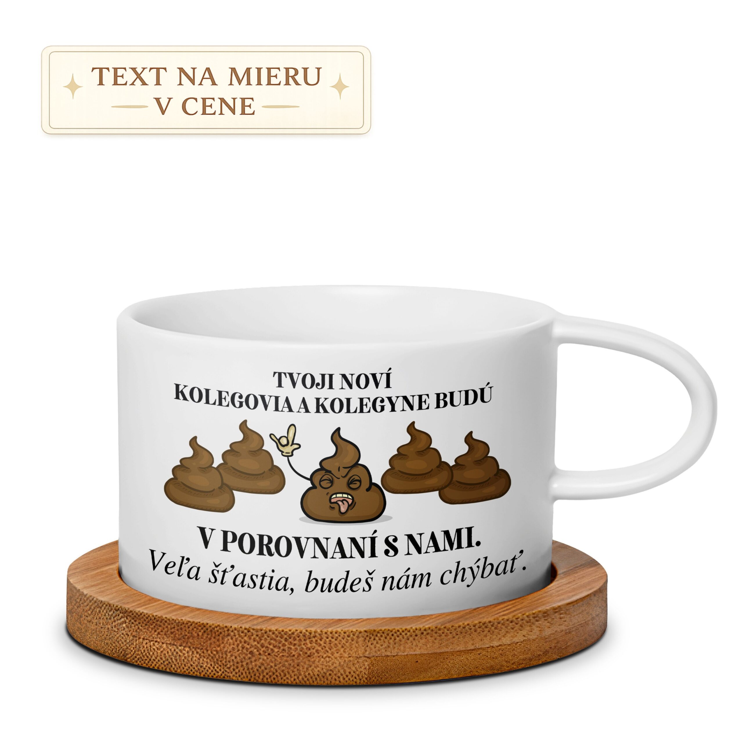 Vtipný hrnček s textom „Tvoji noví kolegovia a kolegyne budú v porovnaní s nami… Veľa šťastia, budeš nám chýbať.“ Originálny darček na rozlúčku s kolegom alebo kolegyňou v práci.