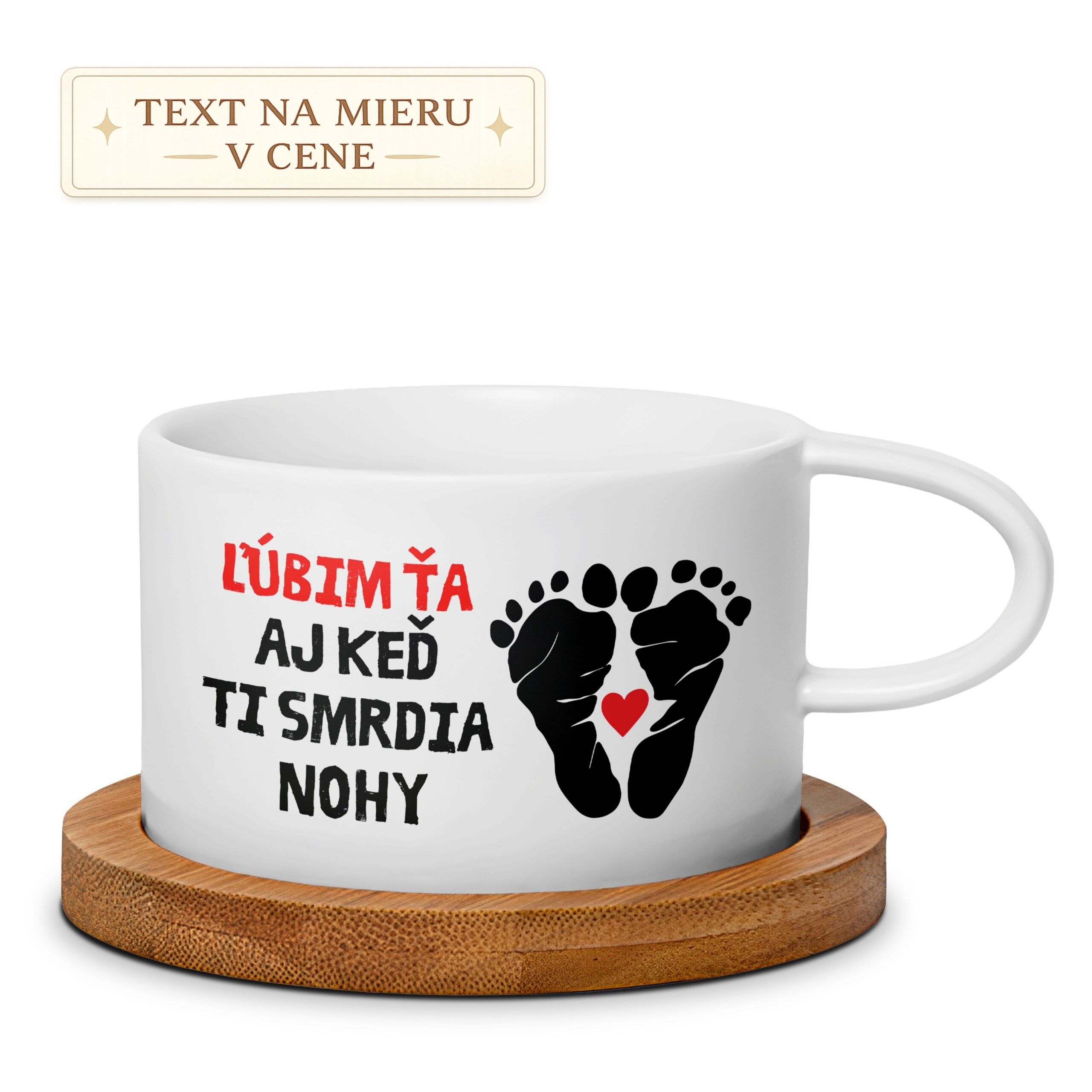 Hrnček s textom „Ľúbim ťa aj keď ti smrdia nohy“.