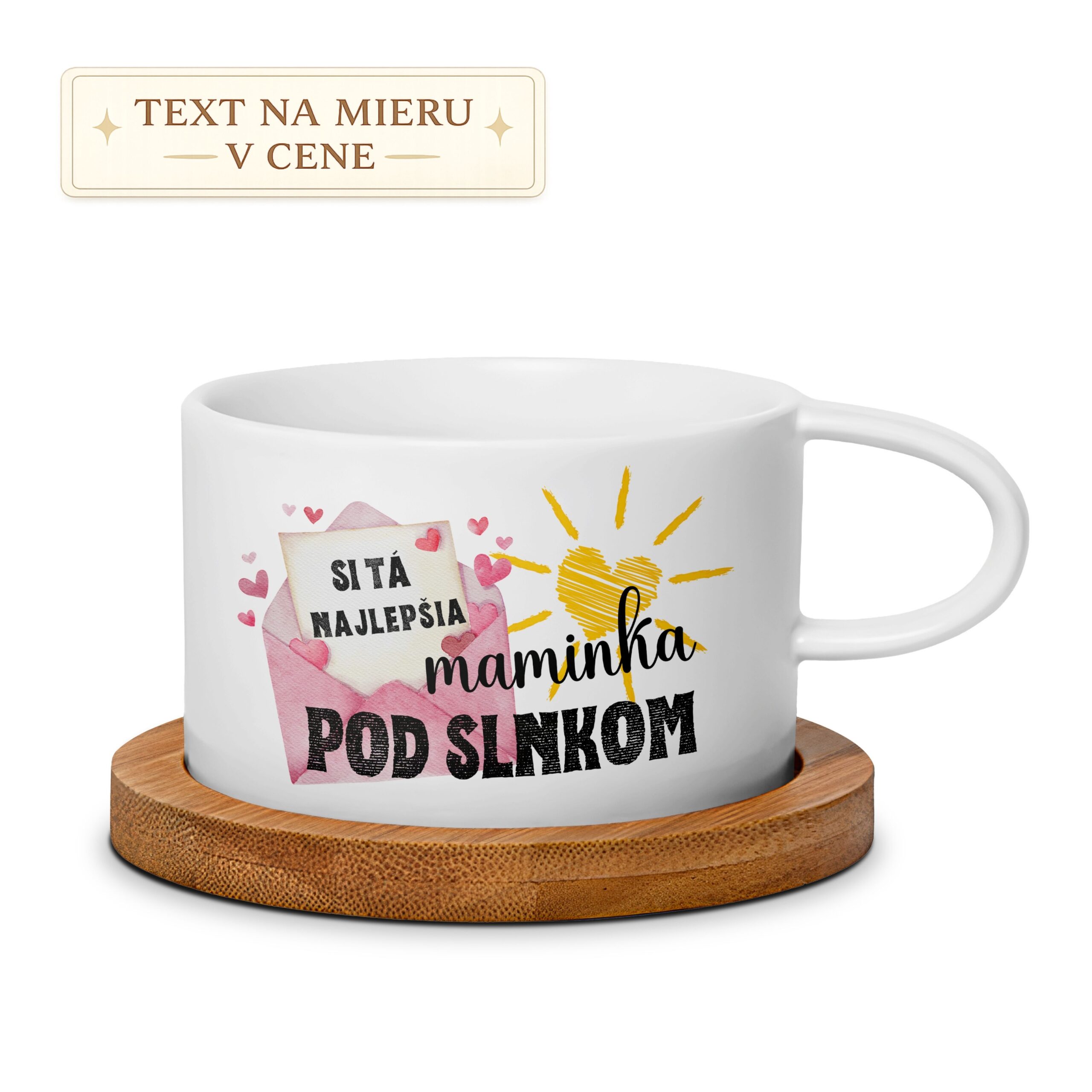 Dizajn dopĺňa ilustrácia obálky so srdiečkami a slniečko v tvare srdca, ktoré symbolizuje lásku, teplo a rodinnú pohodu. Hrnček je ideálny na rannú kávu alebo čaj a každý deň pripomenie vašej mame, ako veľmi ju máte radi.