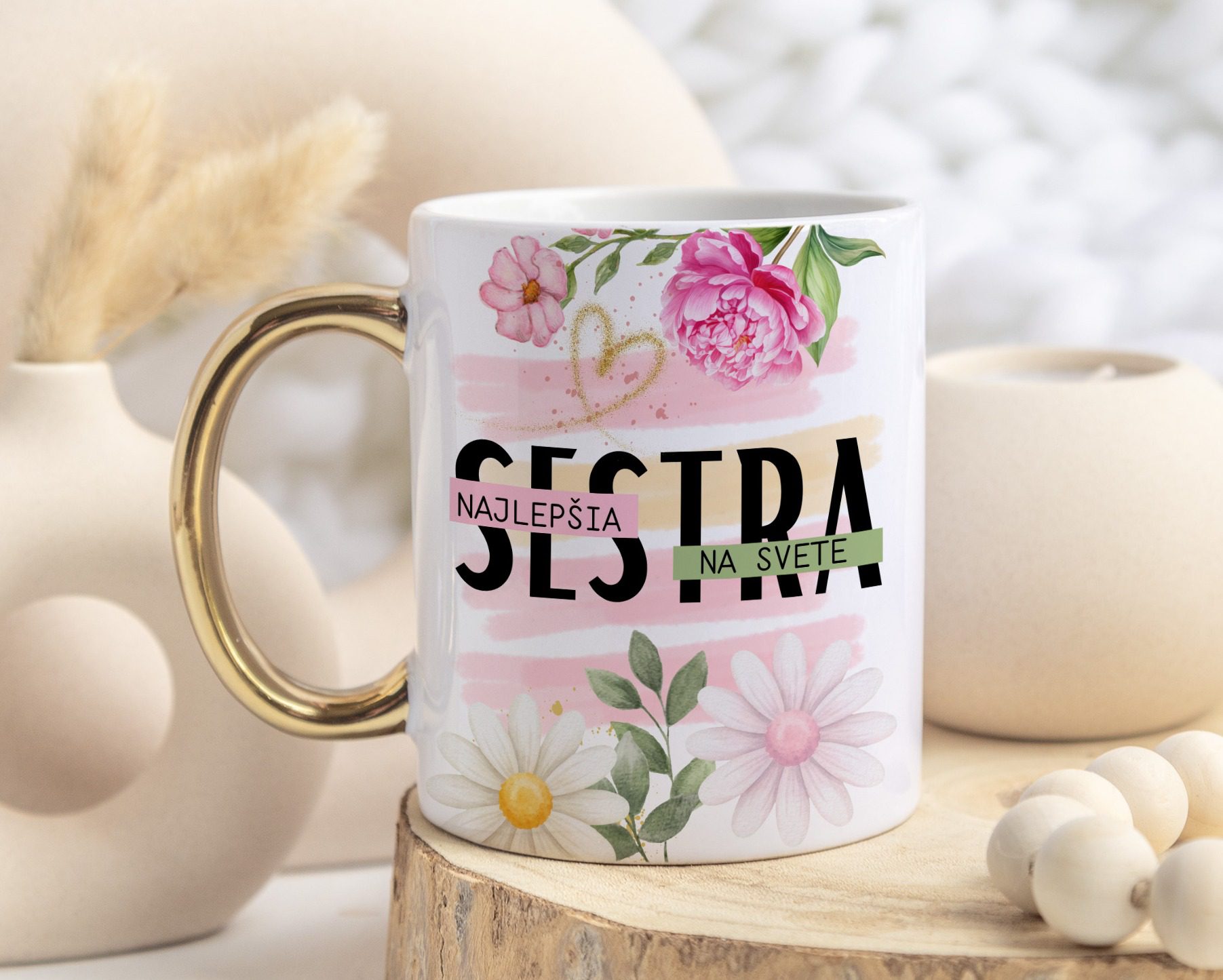 Tento jemný hrnček s kvetinovým motívom a elegantným zlatým uchom je krásnym spôsobom, ako vyjadriť lásku a vďačnosť sestre, ktorá je tu vždy – v radosti aj v ťažších chvíľach. Nápis „Najlepšia sestra na svete“ hovorí jasne a od srdca.