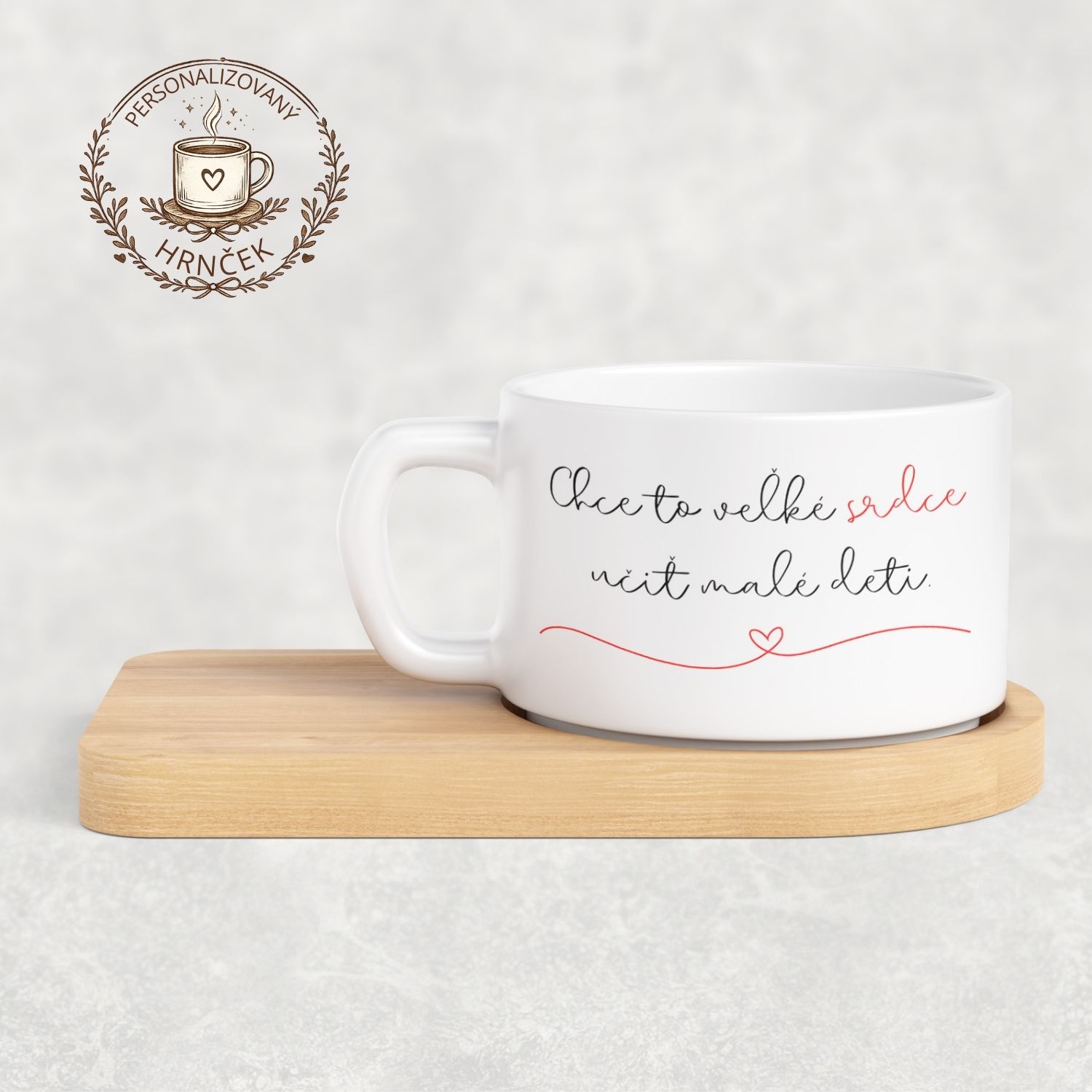Matný hrnček DUO s bambusovou podšálkou – Chce to veľké srdce učiť malé deti