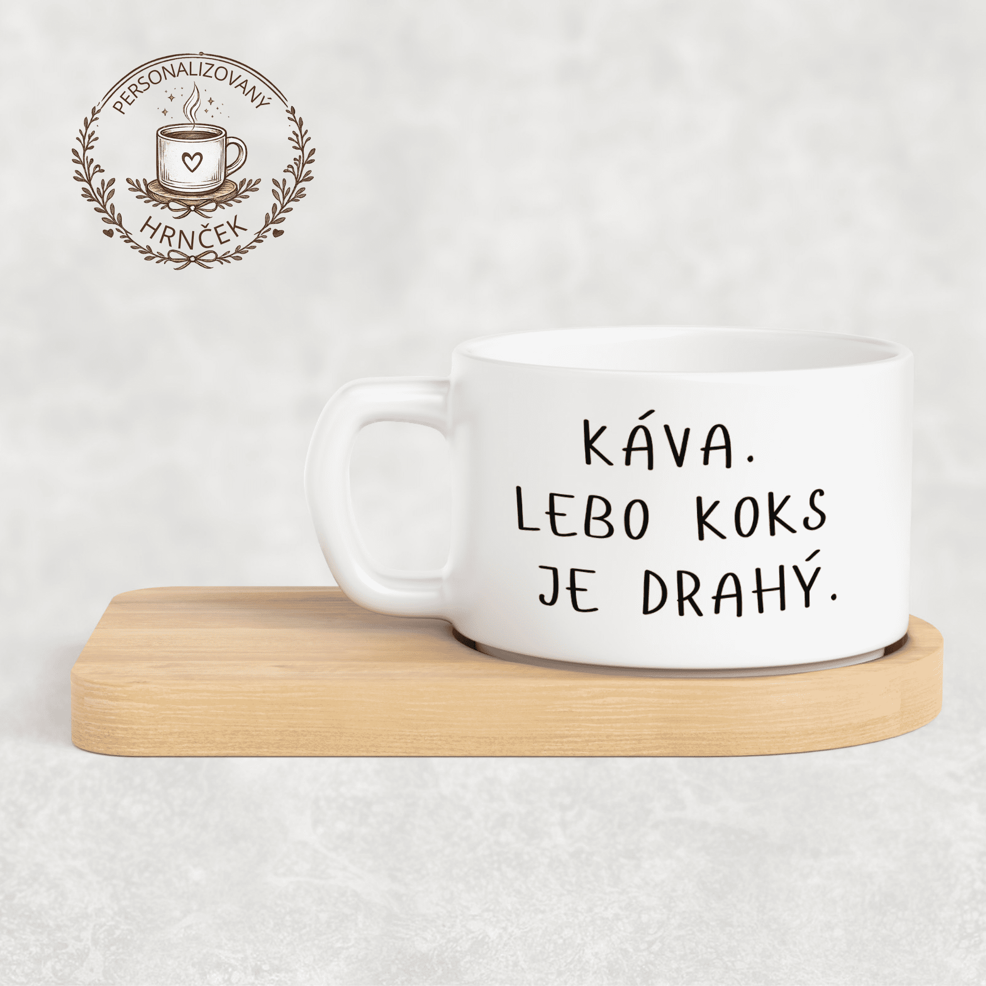 Matný hrnček DUO s bambusovou podšálkou – Káva. lebo koks je drahý