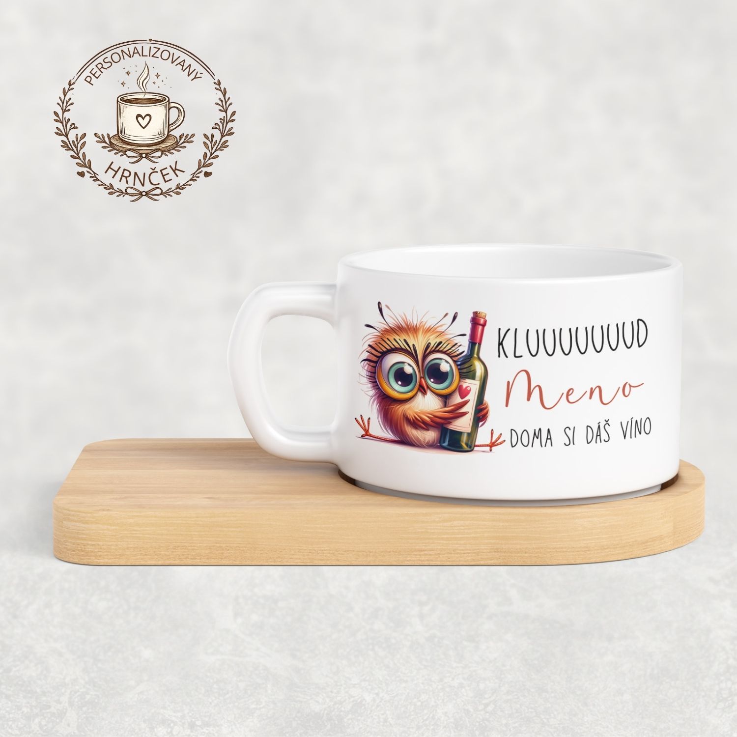 Vtipný hrnček pre všetkých, ktorí vedia, že najlepšia odmena po náročnom dni čaká doma. Roztomilá ilustrácia a hláška „Kluuuuud, doma si dáš víno“ vyčaria úsmev každé ráno pri káve či čaji.Moderný matný povrch v kombinácii s prírodnou bambusovou podšálkou vytvára štýlový darček, ktorý poteší kolegyňu, kamarátku, partnerku aj seba samu. Meno na hrnčeku je možné upraviť – stačí ho napísať do kolonky Text na hrnček. Perfektný tip na narodeniny, meniny, rozlúčku v práci alebo len tak pre radosť.