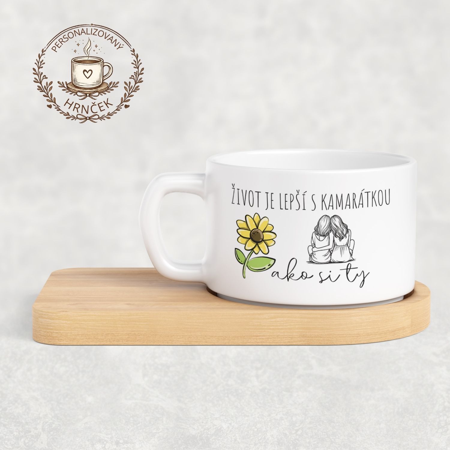 Matný hrnček DUO s bambusovou podšálkou – Život je lepší s kamarátkou ako si ty