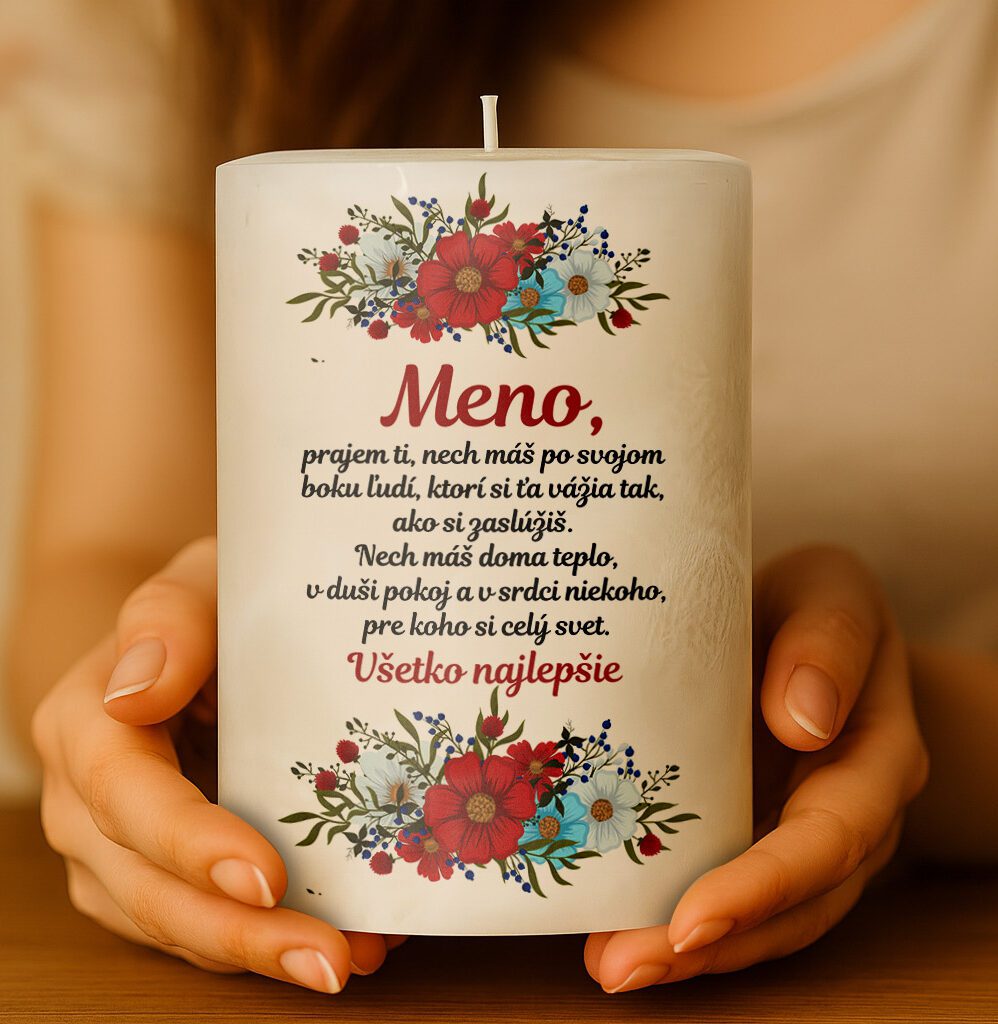 Na sviečku vieme doplniť meno, text, aj vlastné venovanie podľa želania zákazníka – stačí ho uviesť do poznámky pri objednávke. Ak si prajete zachovať text ako na obrázku, nemusíte vypĺňať nič – radi vám ho ponecháme.