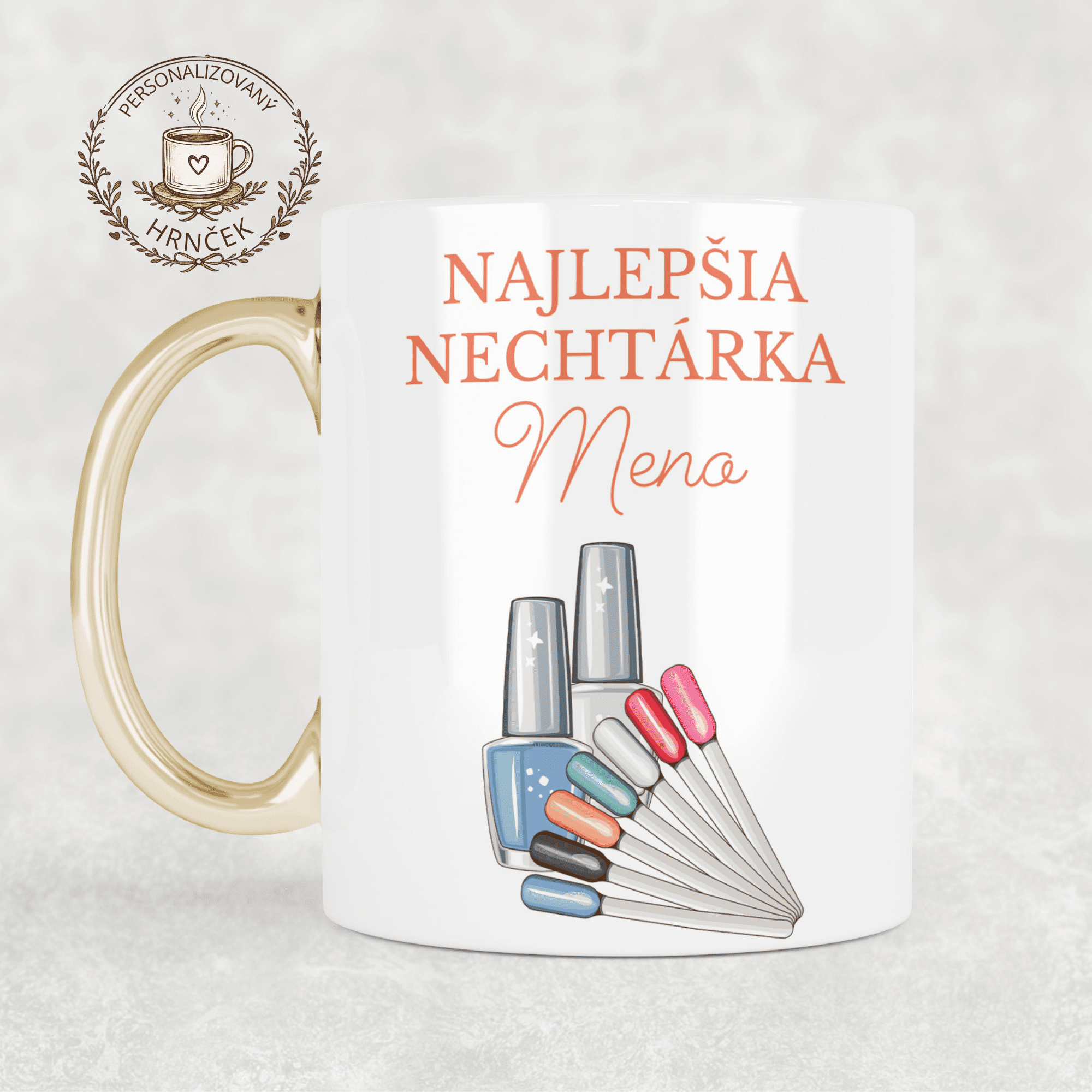 Tento elegantný hrnček je milým a osobným darčekom pre nechtárku, ktorá má zlaté ruky, cit pre detail a lásku k svojej práci. Je ideálny na rannú kávu, poobedný čaj alebo krátku chvíľku oddychu medzi zákazníčkami. Hrnček s objemom 300 ml zaujme jemným, ženským dizajnom a luxusným zlatým uchom, ktoré mu dodáva výnimočný a nadčasový vzhľad. Motív nechtárky je umiestnený na oboch stranách hrnčeka, vďaka čomu je vhodný pre pravákov aj ľavákov. Potlač je vytvorená trvácnou metódou pri vysokej teplote, takže si zachováva sýte farby a ostrosť aj po desiatkach umytí. Hrnček je vhodný aj do umývačky riadu