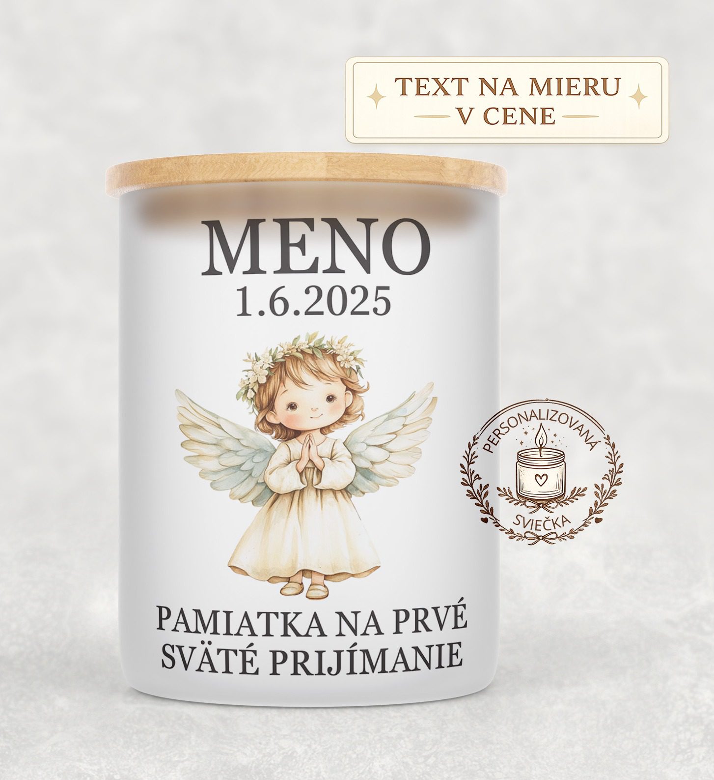 Elegantná sviečka na prvé sväté prijímanie s menom a dátumom. Sviečka je veľká, obsahuje až 550 g prírodného palmového vosku, má jemnú vôňu bavlny a drevený knôt, ktorý pri horení jemne praská. Dizajn na sviečke nie je nalepený, ale vytvorený trvácnou technológiou, vďaka ktorej sa neolupuje a nevybledne. Sviečka je tak krásna nielen počas horenia, ale aj dlho po ňom.