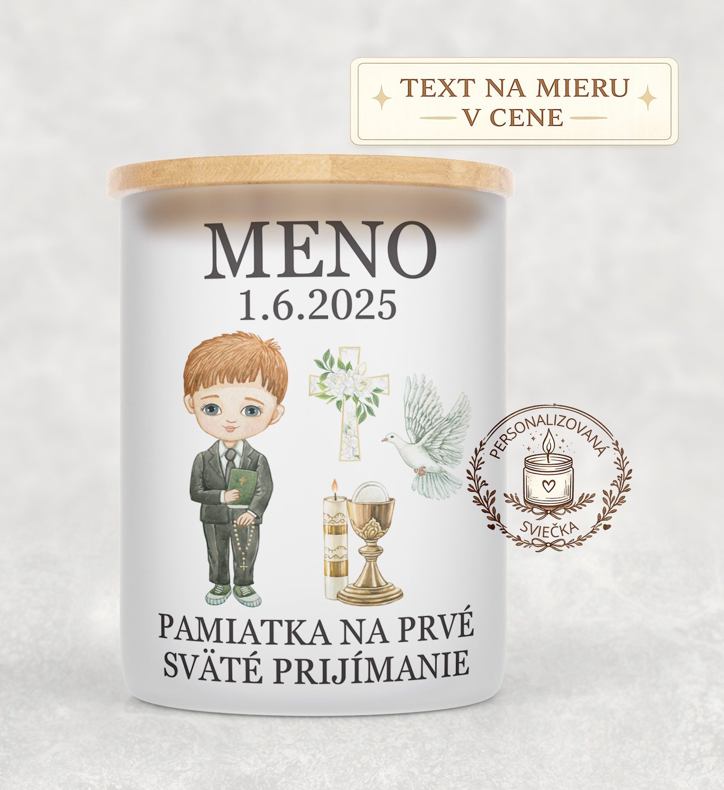 Elegantná sviečka na prvé sväté prijímanie s menom a dátumom. Sviečka je veľká, obsahuje až 550 g prírodného palmového vosku, má jemnú vôňu bavlny a drevený knôt, ktorý pri horení jemne praská. Dizajn na sviečke nie je nalepený, ale vytvorený trvácnou technológiou, vďaka ktorej sa neolupuje a nevybledne. Sviečka je tak krásna nielen počas horenia, ale aj dlho po ňom.