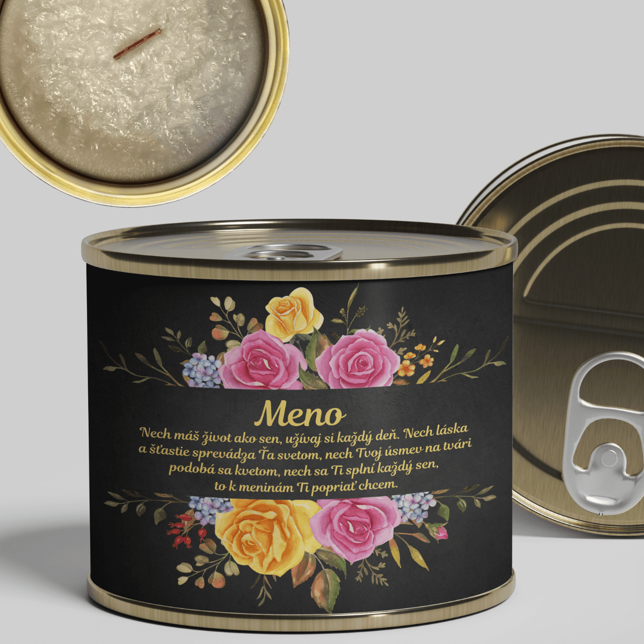 Originálny meninový darček – ručne odlievaná sviečka v štýlovej konzerve s dvoma drevenými knôtmi a vôňou čistej bavlny. Prispôsobíme meno, prianie aj venovanie podľa želania.