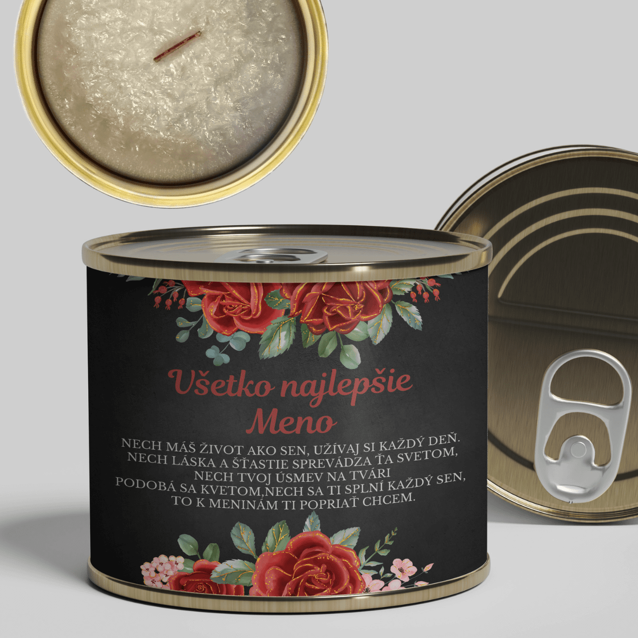 Originálny meninový darček – ručne odlievaná sviečka v štýlovej konzerve s dvoma drevenými knôtmi a vôňou čistej bavlny. Prispôsobíme meno, prianie aj venovanie podľa želania.