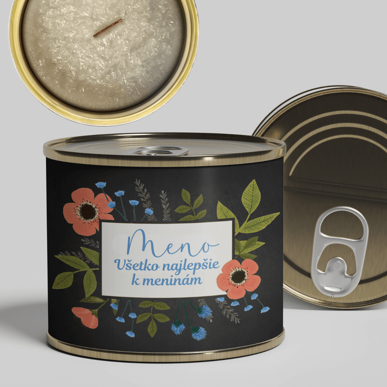 Originálny meninový darček – ručne odlievaná sviečka v štýlovej konzerve s dvoma drevenými knôtmi a vôňou čistej bavlny. Prispôsobíme meno, prianie aj venovanie podľa želania.