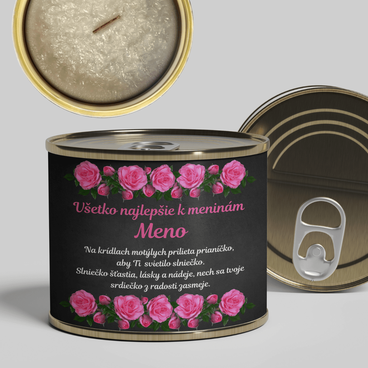 Originálny meninový darček – ručne odlievaná sviečka v štýlovej konzerve s dvoma drevenými knôtmi a vôňou čistej bavlny. Prispôsobíme meno, prianie aj venovanie podľa želania.